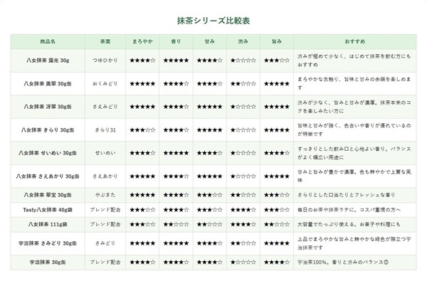 | 八女抹茶 冴翠 30g缶 | さえみどり | ★★★★★ | ★★★★☆ | ★★★★★ | ★☆☆☆☆ | ★★★★★ | 渋みが少なく、旨みと甘みが濃厚。抹茶本来のコクを楽しみたい方に |