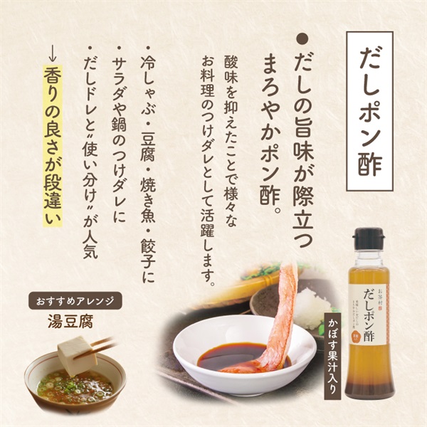 原材料名:うすくちしょうゆ(国内製造)、砂糖、醸造酢、食塩、かぼす果汁、粉末かつお節、イリコエキス、茶葉、焼あごエキス、こんぶエキスパウダー/調味料(アミノ酸等)、ビタミンB1、甘味料(ステビア、甘草)、(一部に小麦、大豆を含む)